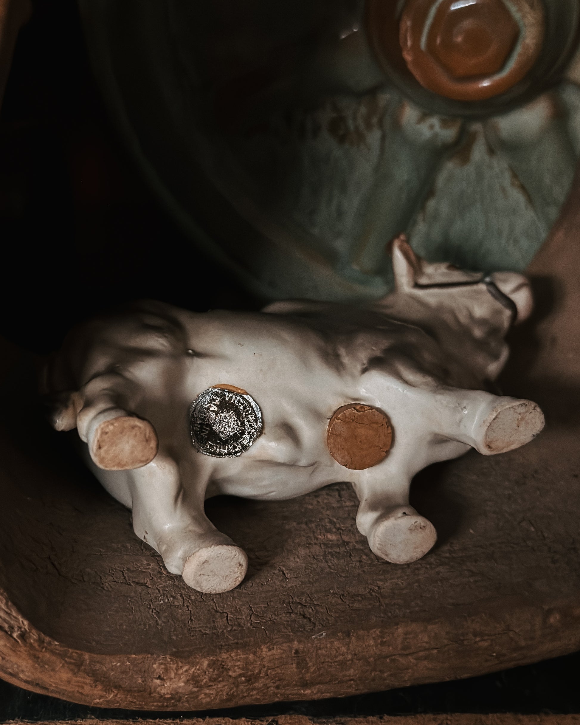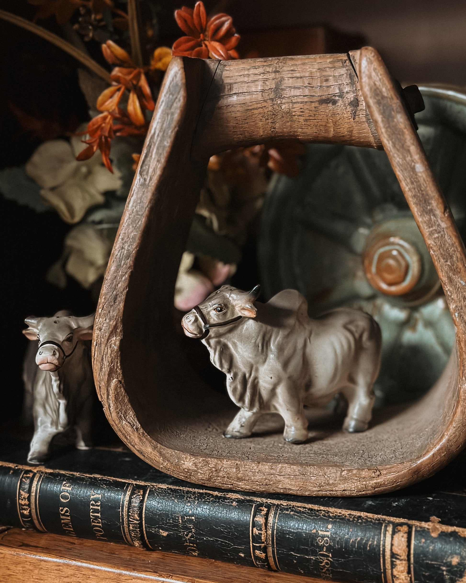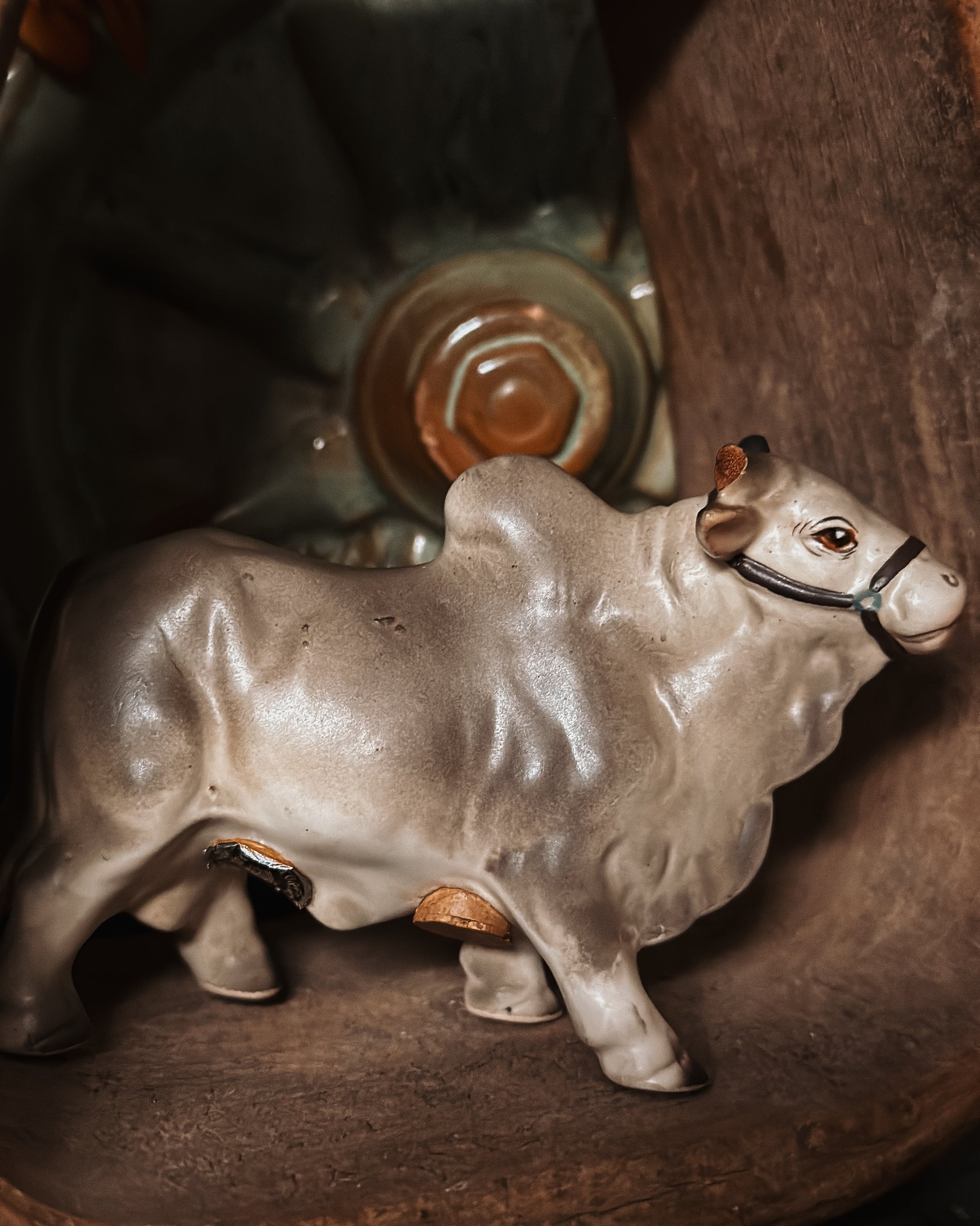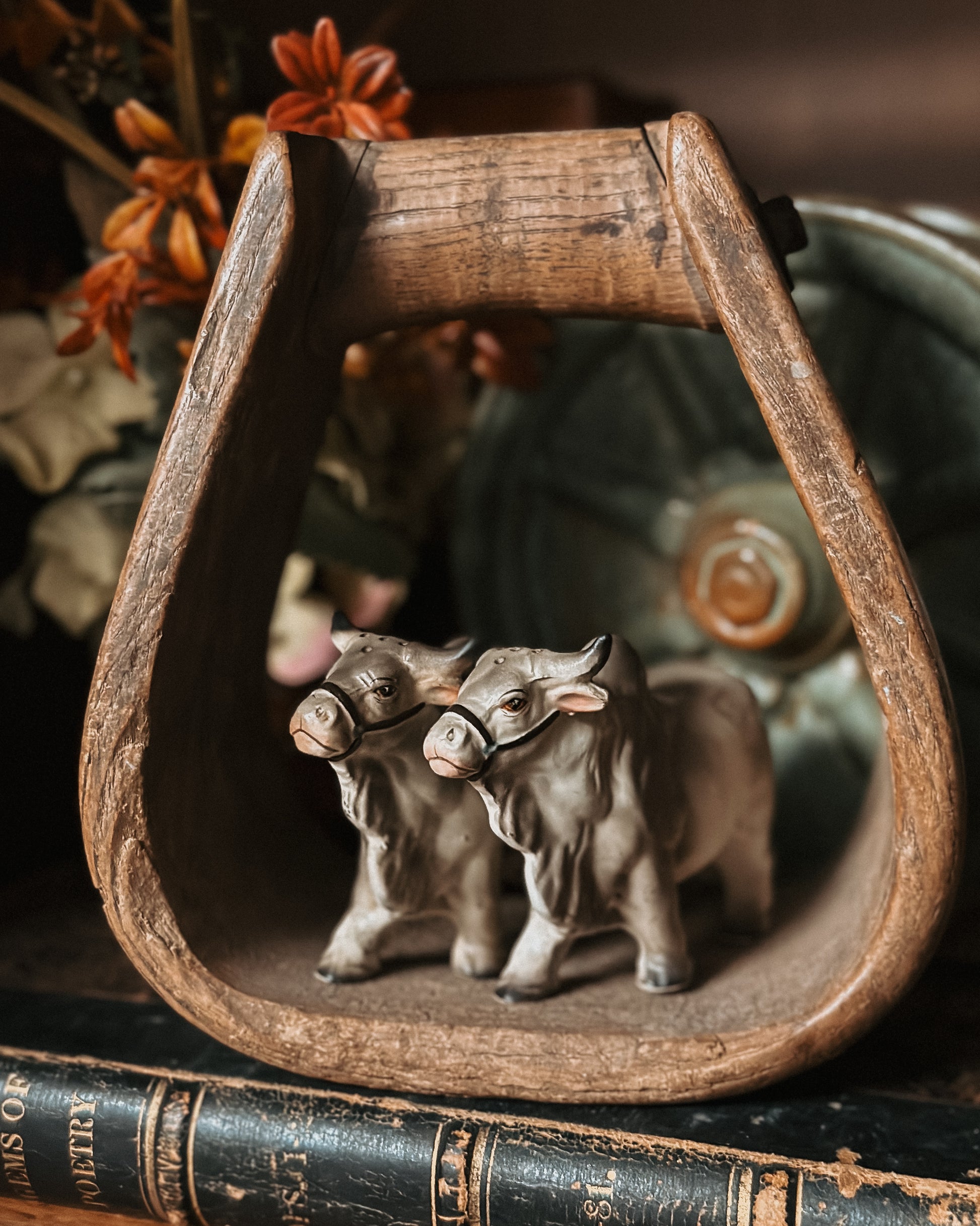 Made of ceramic and designed to resemble Brahma bulls known for their distinctive humps. They are a light grayish color that were produced in Japan in the 1950’s! They have the original stickers and cork stoppers. Unfortunately one of the bulls’ horns was broke off at some point in his life, please view all pictures to view this imperfection!