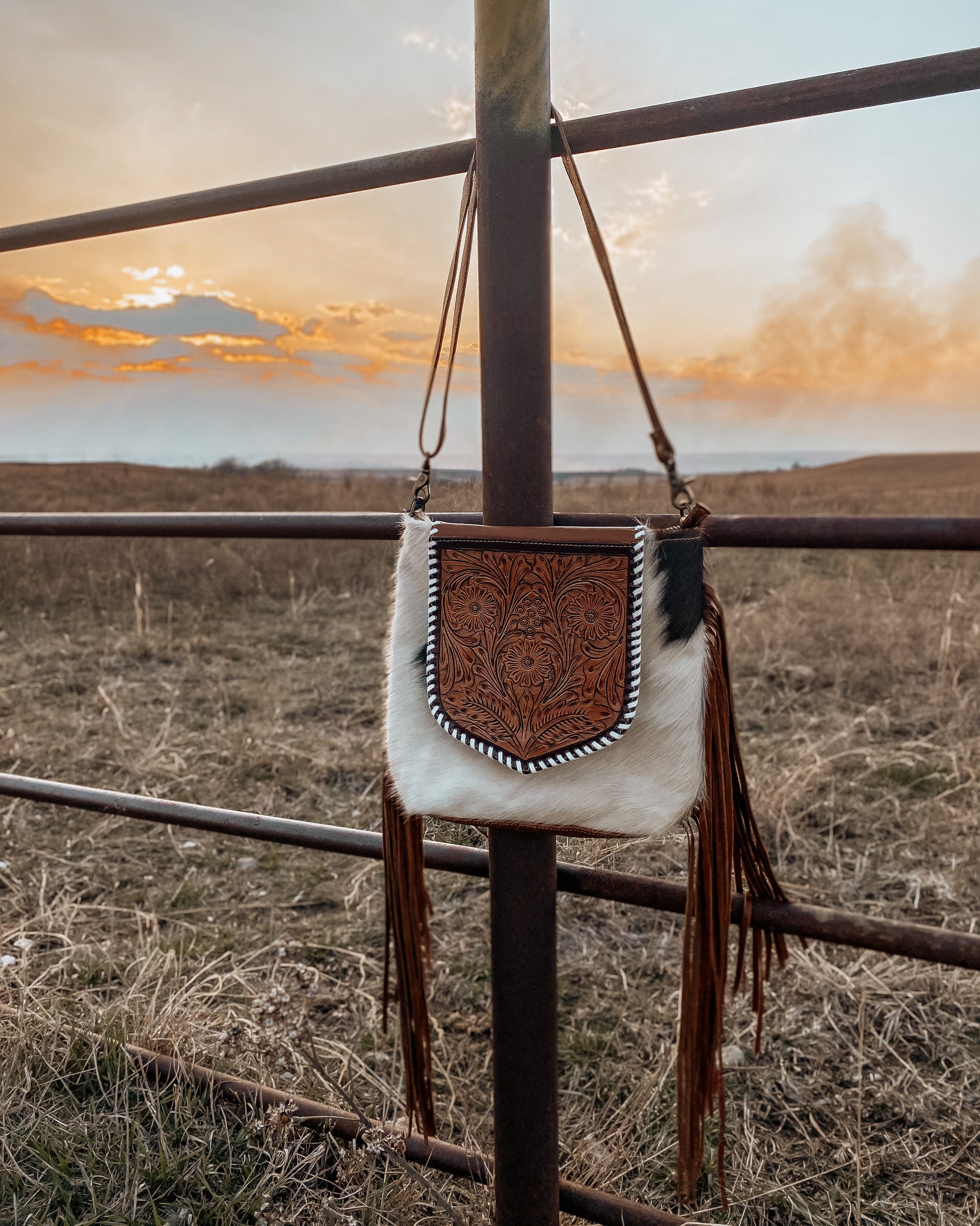 This bag is STUNNING! The Squander bag features a hand tooled flap, fringe, and a beautiful black and white hide.