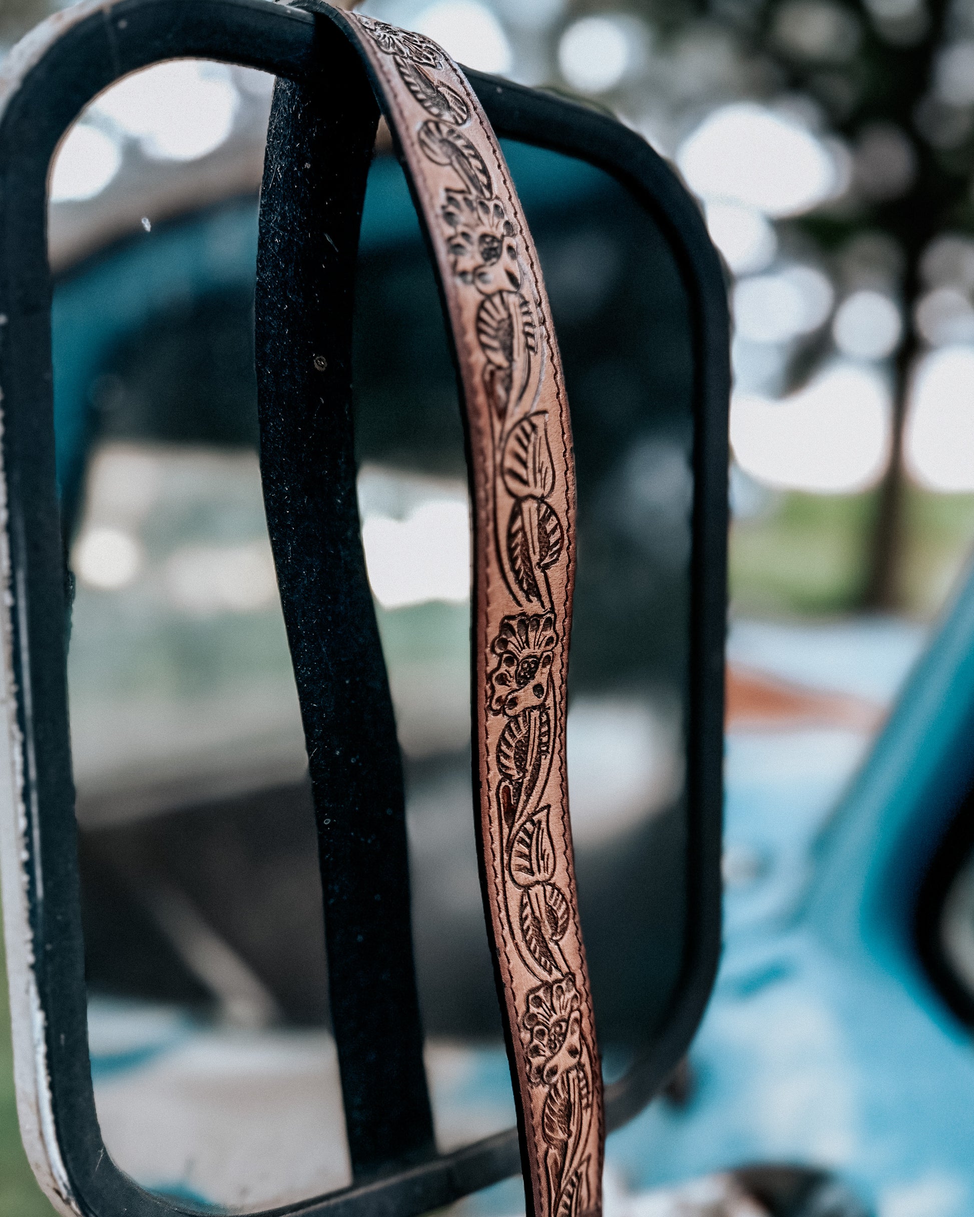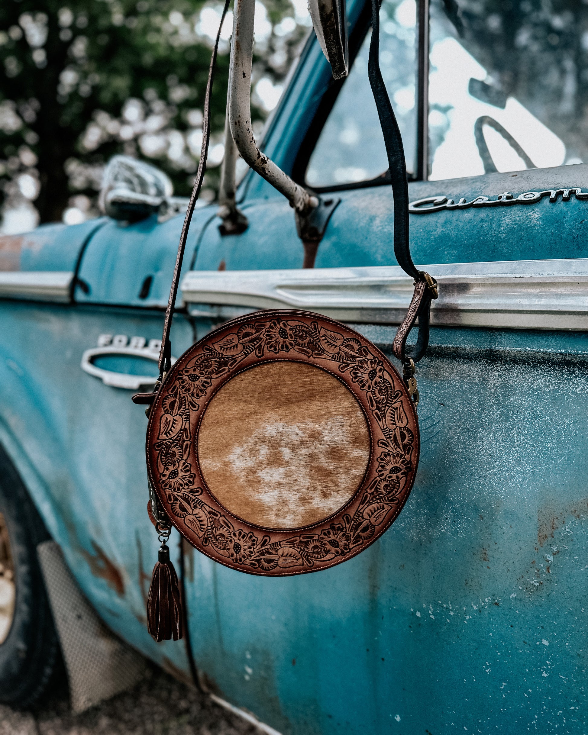 This bag features a hair-on hide front with a gorgeous tooled leather outline, with matching warm chocolate brown leather back, which also has a zippered pocket. Zipper-close top with matching leather shoulder strap that’s fully detachable and adjustable.