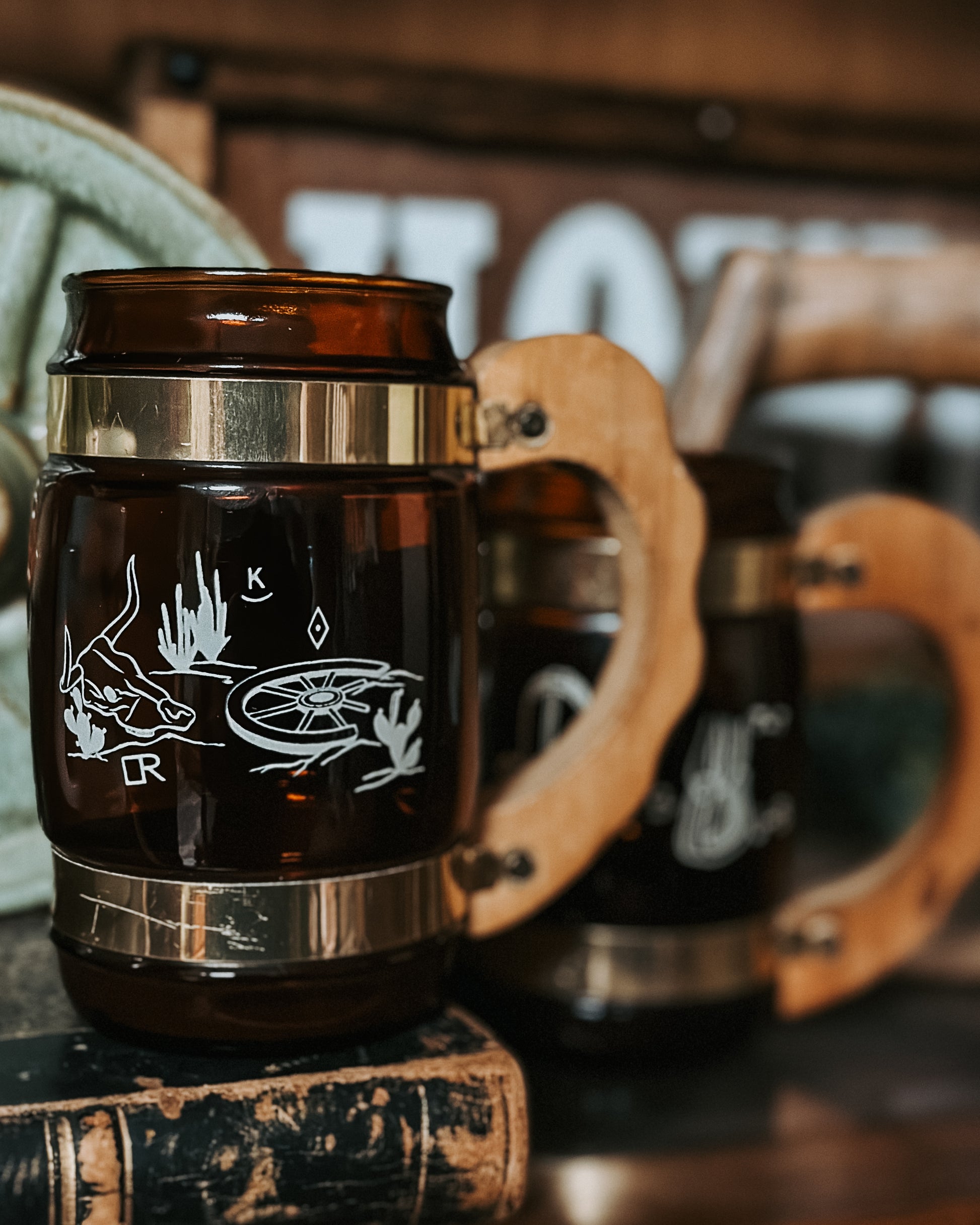 Set of 4 1950’s Siesta Ware Amber Glass Barrel Mugs with wood handles and western designs.